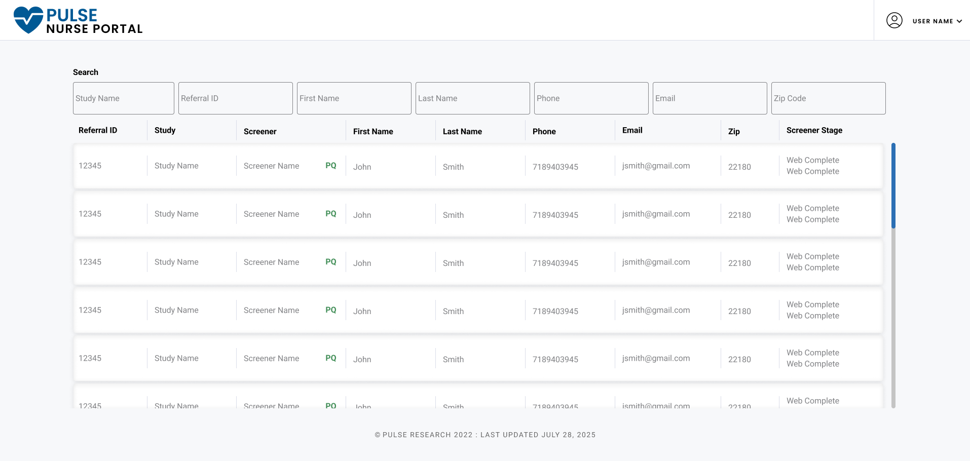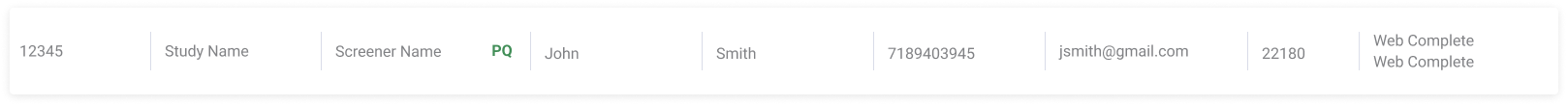 To improve readability and streamline user interaction, row cards were designed to function as modular, self-contained data objects representing individual referrals. Each card surface displays the minimum required identifying information, along with key contextual details such as the screener name, current status (e.g., PQ, DQ, Incomplete), and any associated action prompts. This structure enables nurses to quickly assess referral states and determine whether follow-up is needed, such as contacting participants who qualified, were disqualified, or became inactive. A subtle hover elevation effect was introduced to provide immediate visual feedback and reinforce object interactivity, an enhancement that users described during testing as “very satisfying” and intuitive.